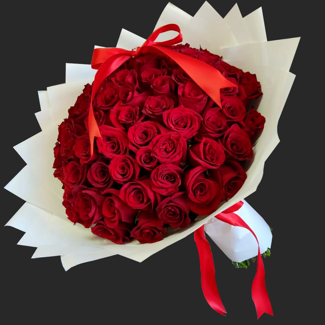 Bouquet de 50 rosas rojas, lazo roja y papel koreano.